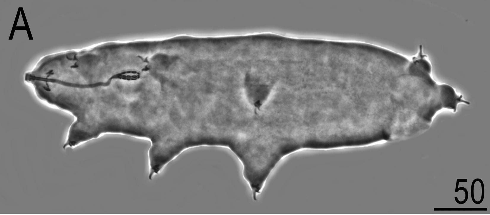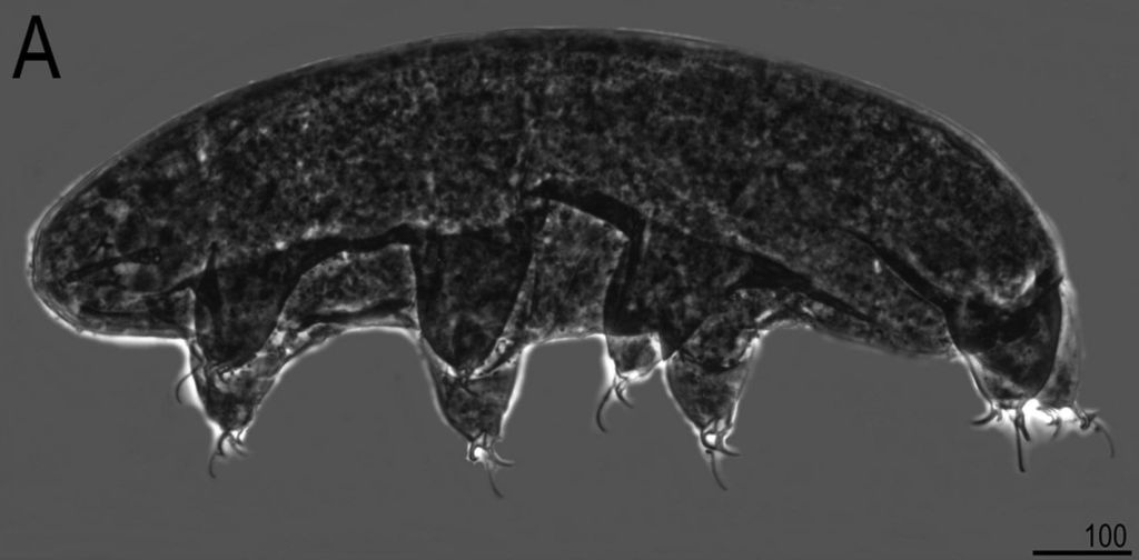 A close-up view of the newly described “water bear” Kararehius gregorii found in snow on the Fox, Franz and Whataroa glaciers. The scale bar is in micrometres, so the whole bear is about 0.5 mm long.